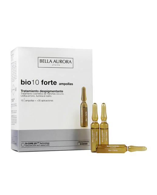 El tratamiento despigmentante Bio10 Forte Pharma es un tratamiento intensivo diseñado para combatir las manchas de origen inespecífico. Esta fórmula única contiene una combinación de activos que incorpora la exclusiva tecnología despigmentante B-CORE221TM, un innovador sistema de encapsulación y liberación dirigida. El producto actúa directamente sobre las células productoras de melanina, donde libera íntegramente el activo encapsulado, logrando así una mayor eficacia. Además, incorpora una mezcla de extractos naturales que protegen la piel frente a los agentes contaminantes externos. Este tratamiento es ideal para pieles preocupadas por manchas oscuras, ya sean solares, hormonales, melasmas, lentigos seniles, marcas post-inflamatorias inducidas por tratamientos dermatológicos, luz azul contaminante, marcas de acné y cicatrices. Es importante señalar que no es fotosensibilizante, por lo que se puede aplicar durante todo el año, incluso en verano, y es totalmente apto para mujeres embarazadas y en periodo de lactancia.